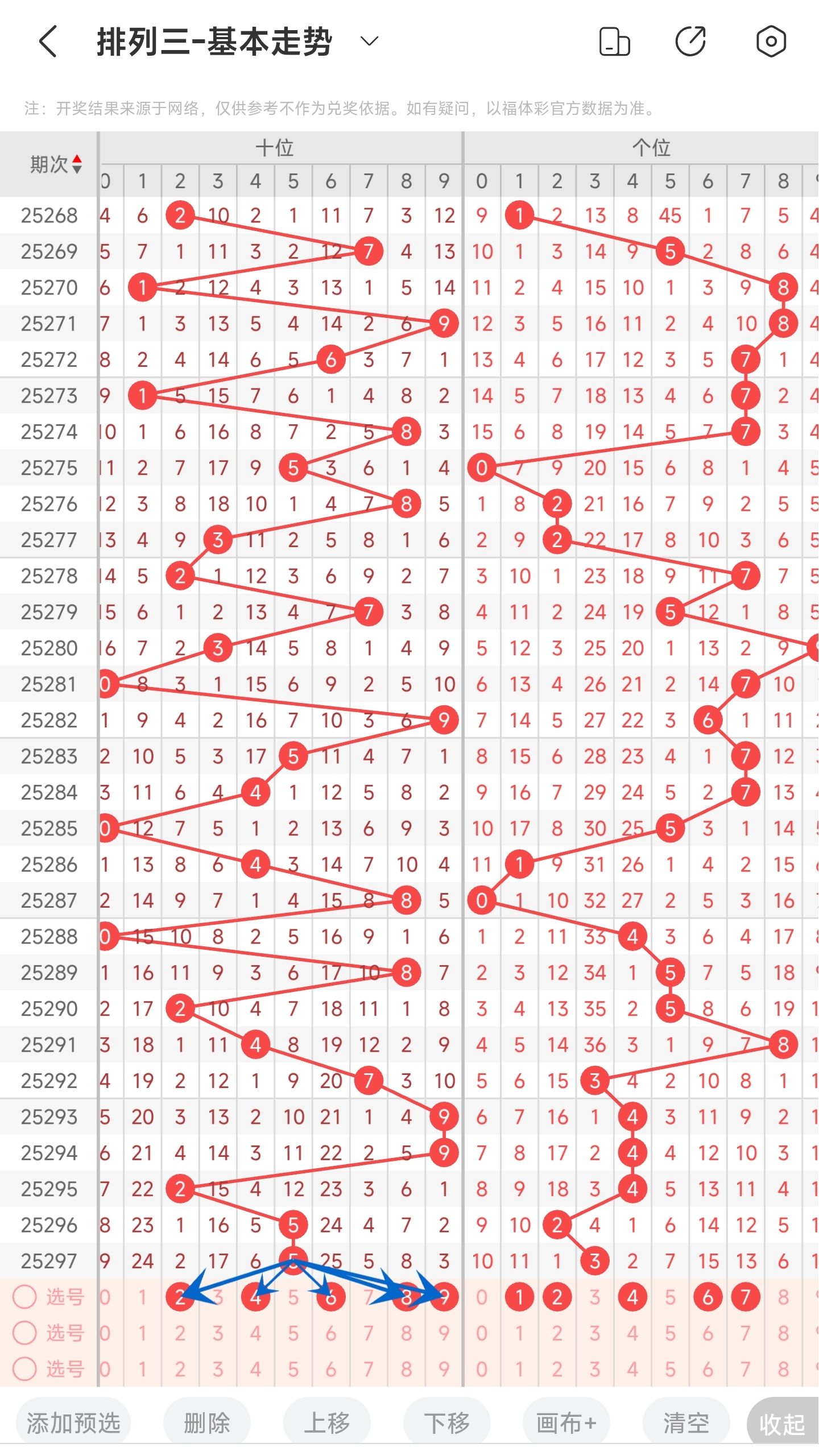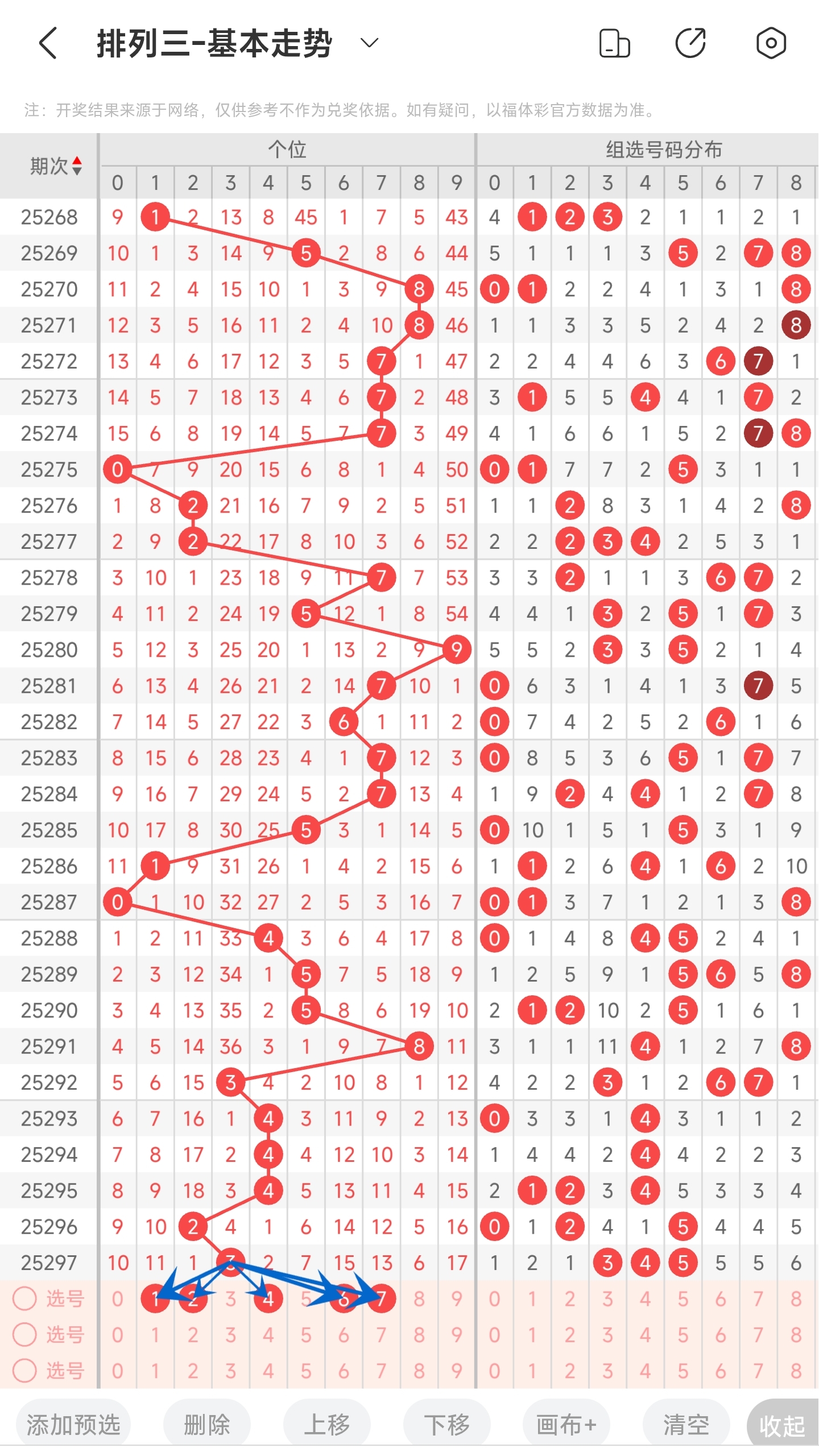 上期开出了4号球。往前一期开出的是0号球。趋势往右移动,偏移了4个点。通过走势图分析,目前的趋势是可能往左也可能往右,所以两边的号码都要关注一下。偏移量的话本期看好中小等偏移量的号码。最后再结合遗漏期数和冷热号,本期我们可以关注01568号球。综上所述本期我们推测可能开01568等号码。