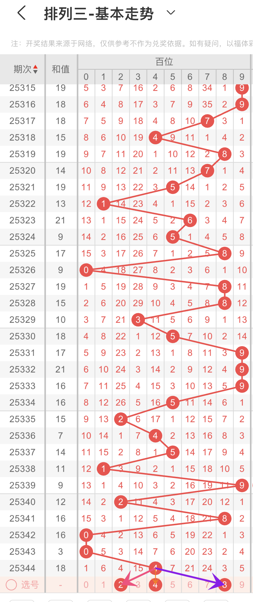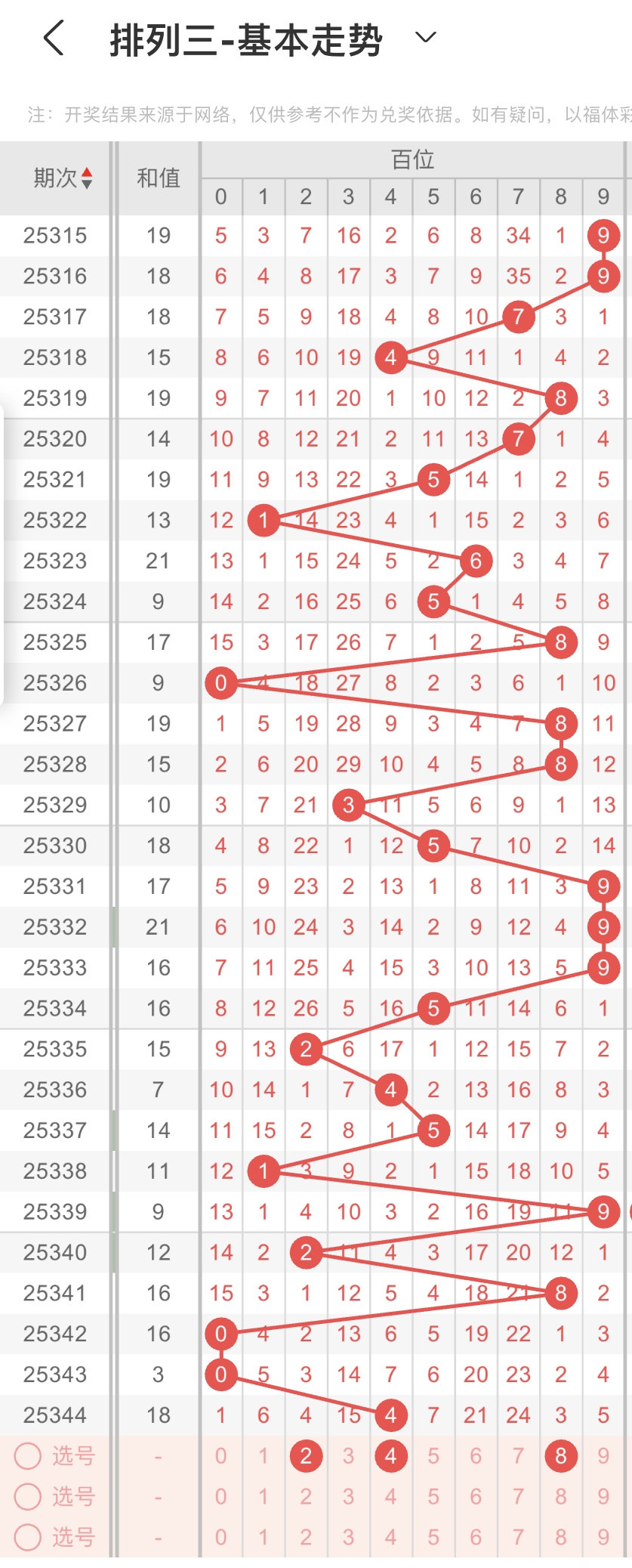 结合上面的大小、奇偶以及012路比,我们可以得到的数据分别是第一组56789,第二组02468,第三组258,我们重点选择3组数据中重复的,那百位我们选择8,防2路的2,防1的4,综上所述百位选248
