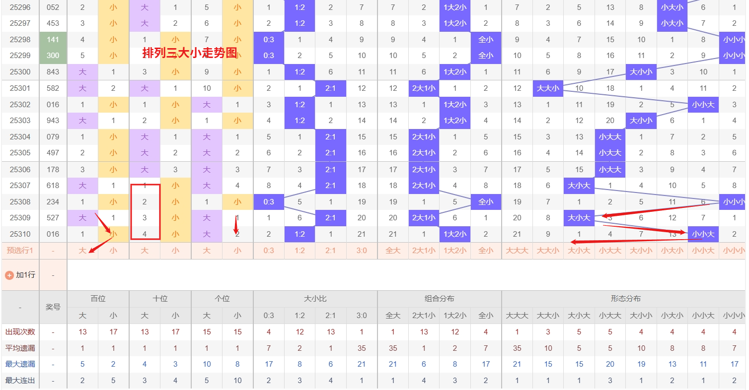 排列三 大小形态分析:从大小走势图上可以看出排列三100期内百位大小比约为47比53,十位大小比约为49:51,个位大小比约为54比46,除了个位奇数比偶数多,十位和百位是偶数比奇数多。历史数据近2期开出小小大下一期的走势为,第233期开出小小大第234期开小大小。第242期开出小小大后第243期开大大小,第256期开出小小大后257期开大大大。近期排列三的大小形态走势来看,“小大小”组合持续活跃,已成为明确的热态格局,这种强势态势意味着它在短期内仍有较高的开出概率,是当前需要重点跟踪的对象。而反观“大大大”全大组合,则陷入了明显的冷态周期,遗漏期较长,从概率回补的角度分析,其反弹的动能正在不断积聚,冷极转热的风险不容忽视。因此,在接下来的投注策略上,采取“追热防冷”的思路,在重点关注“小大小”热号延续的同时,对“大大大”这类冷号的突然回补提高警惕,所以排列三第2025311期大小形态推荐小大小防大大大。