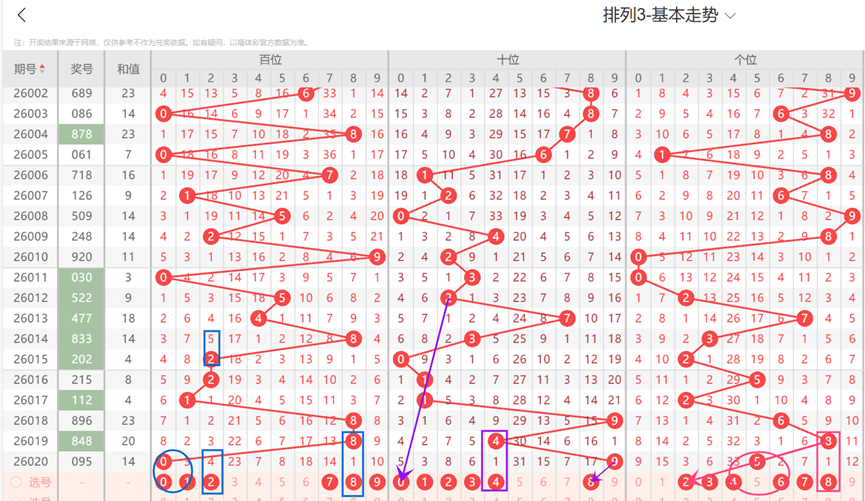 上一期百位开出号码为0,为偶数、小数、合数、0路号码:近10期百位34等号码较少出号,本期百位开出34等号码的可能性小,因此本期百位选号时应该考虑34以外的号码,结合上述走势图看,本期百位看好012789等号码。