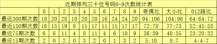 个位分析:最近300期奖号由冷到热表现为:921,0525,627,830,131,434,2735,337次,该位号码奇偶比为149:151,大小比为138:162012路比为110:100:90