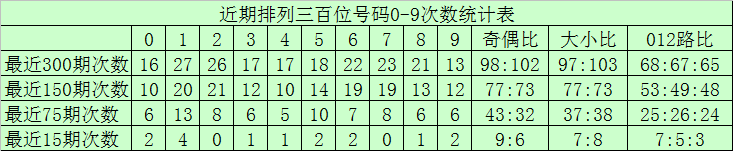 百位分析:最近300期奖号由冷到热表现为:019,426,528,929,830,3631,233,735,138次,奖号奇偶比为161:139,大小比为153147012路比为110:99:91
