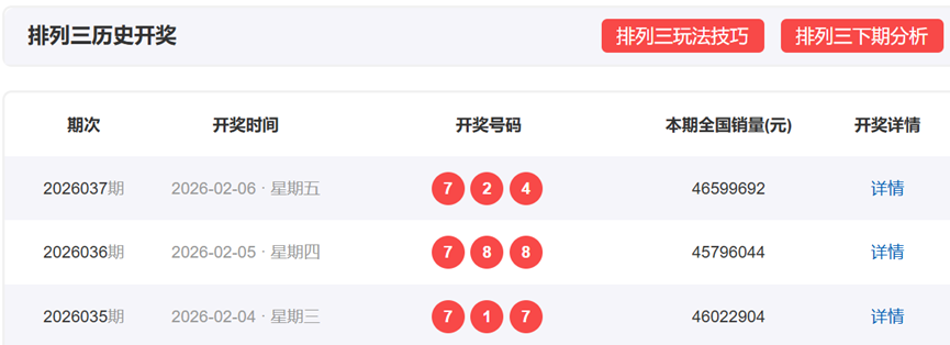 体彩排列3上一期,开奖号码为724,形态为组六,奇偶比为1:2,012路数值表现为121,和值13,和尾3,跨度5。