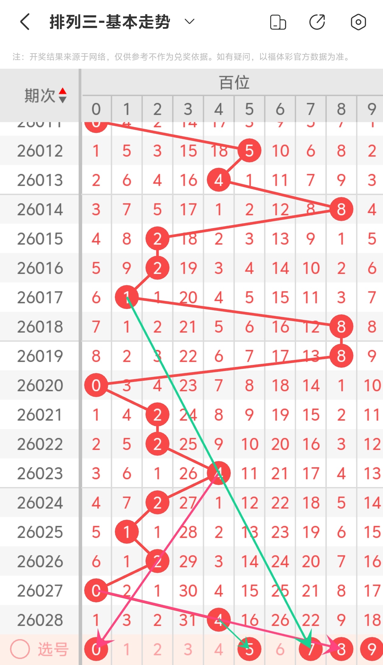 上期百位开出4,本区与上期的跨度为4,本期我们可以从上面走势图中看出选号的思路,0为斜连走势跨度为四,5为分边走势,7为斜连走势跨度为三,8为斜连走势跨四,综合以上分析,本期百位推荐:05789