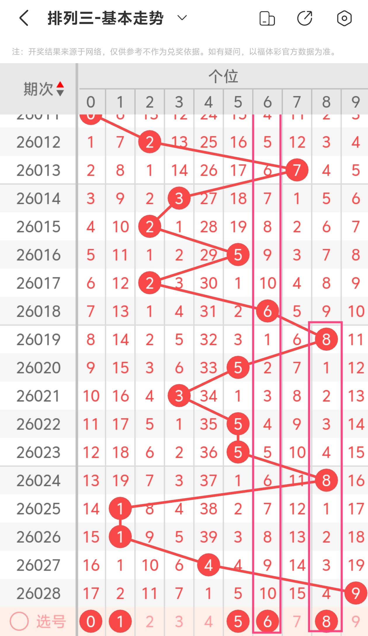 上期个位开出9,本区与上期的跨度为5,本期我们可以从上面走势图中看出选号的思路,6为对称形态走势跨度为三,8为对称形态走势跨度为一,综合以上分析,本期个位推荐:01568