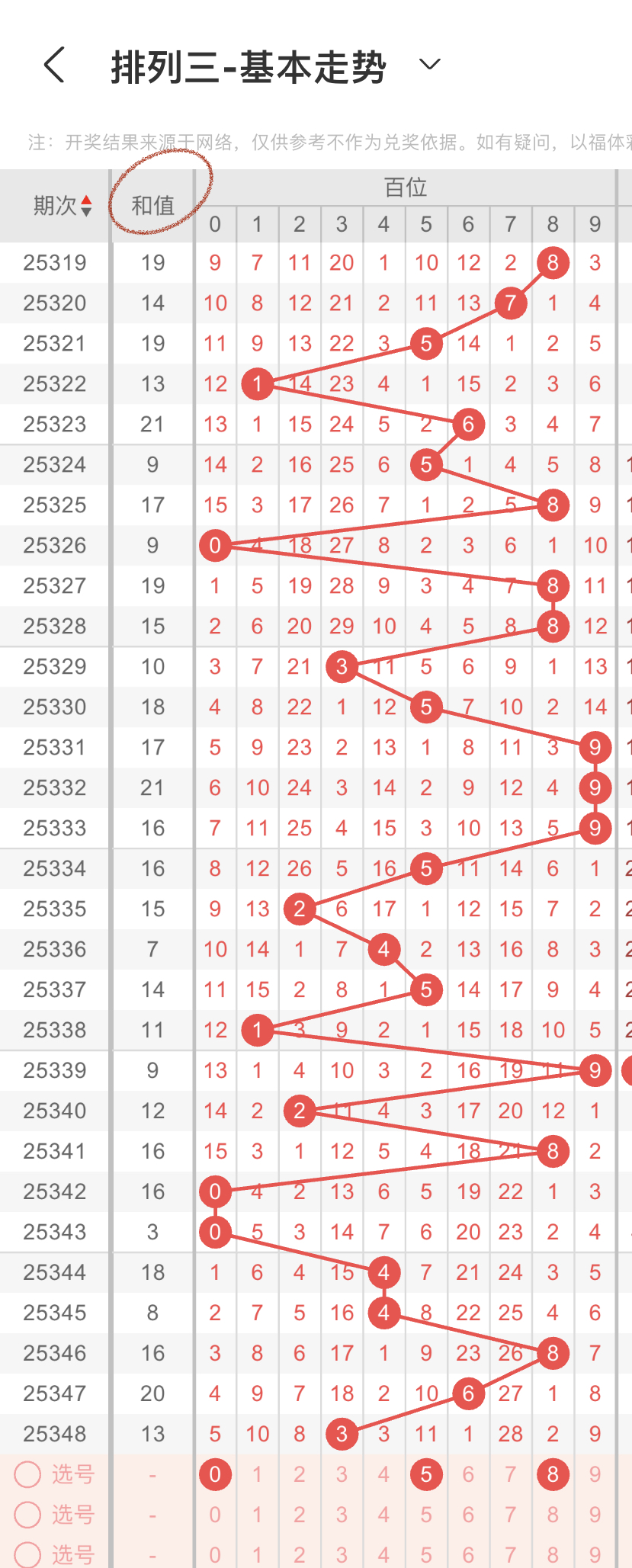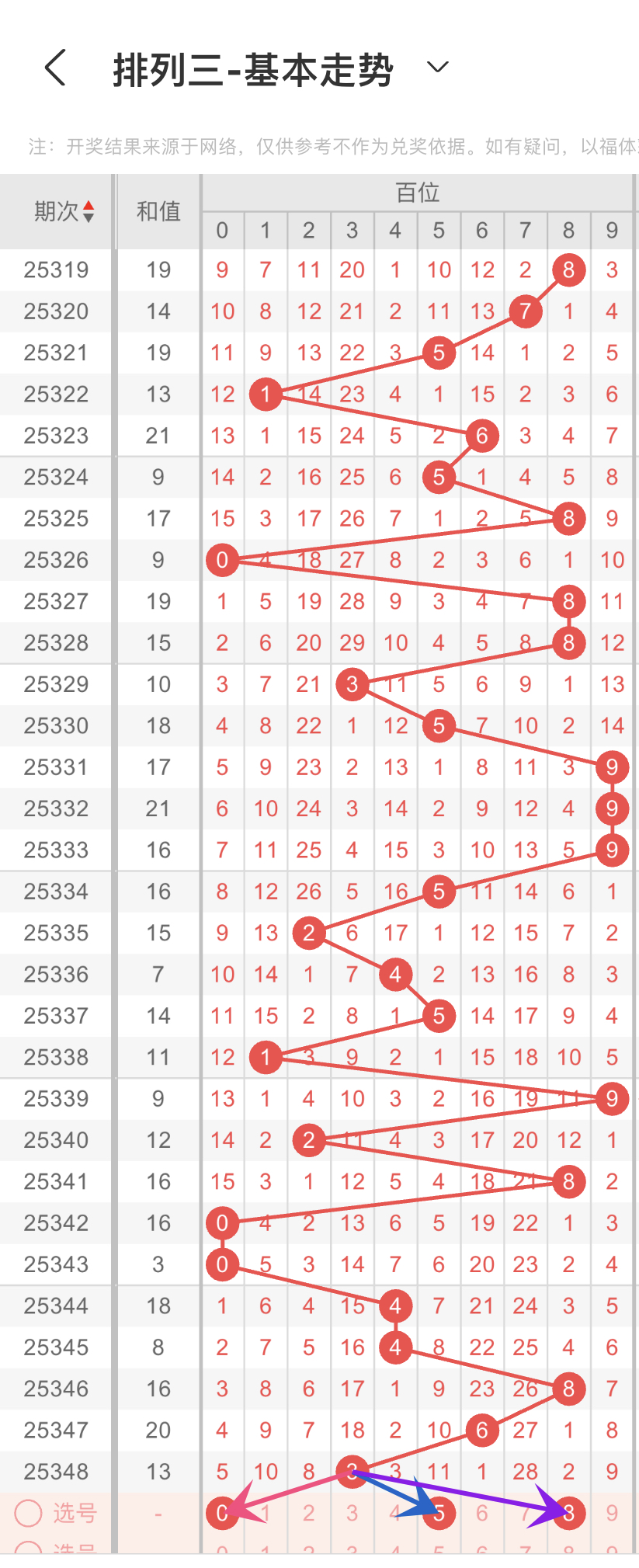 结合上面的大小、奇偶以及012路比,我们可以得到的数据分别是第一组01234,第二组02468,第三组0369,我们重点选择3组数据中重复的,那百位我们选择0,防2路的58,综上所述百位选058