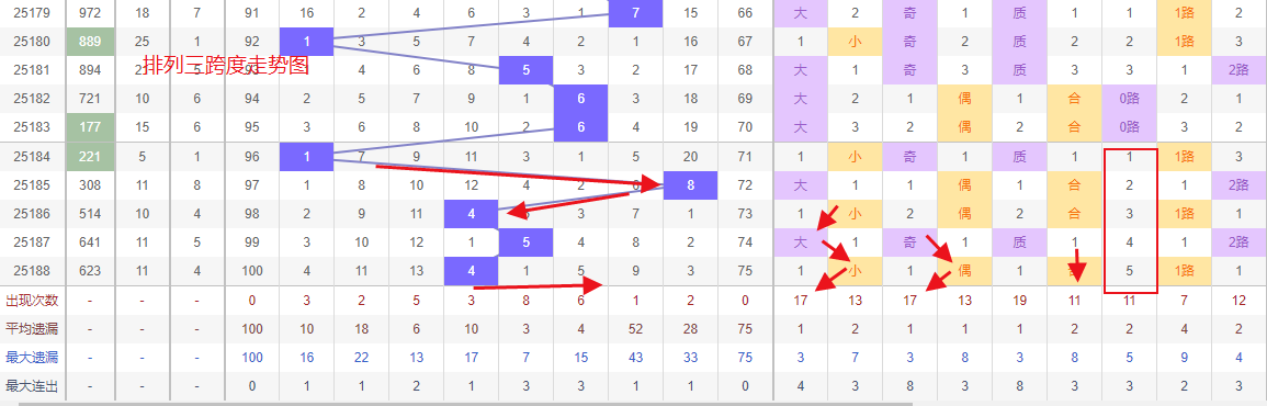 排列三 跨度分析:从上图可以看出近100期的跨度大小比约为51比49,跨度奇偶比约为53比47总体来看还是比较均衡的,但跨度大小之间有点差异。我们再从历史开出4跨后下一期2跨度数据来做参考。最近10期跨度大小比约为6:4近期开出大数跨度过多返回小数跨度的概率更高一点。历史开奖近2期出4跨以后的走势为094期开出4跨后下一期走2跨走出2振幅,第107期开出4跨后下一期走5跨走出1振幅第118期开出4跨后下一期开出6跨走出2个振幅。连续多期小振幅。近期排列三跨度走势呈现明显分化,其中2跨和7跨持续低温表现,成为当前冷号区间,短期内尚未出现明显回暖迹象,需耐心等待回补信号;而5跨和6跨则表现强势,近期频繁开出,热度居高不下,从走势来看仍有连开可能,需要重点防范其持续走热。在选号策略上,优先关注5跨和6跨的延续性,适当跟进其热态表现,同时也要留意冷跨2和7的潜在反弹机会,毕竟冷号一旦回补往往会有不错的表现。综合以上分析后得出,本期预计跨度遵从历史会走出小振幅,出4跨度后容易走出2到4个跨度振幅的对称形态,跨度走出2到4个振幅看好的跨度有2567跨,所以第2025189期排列三跨度推荐2567跨。