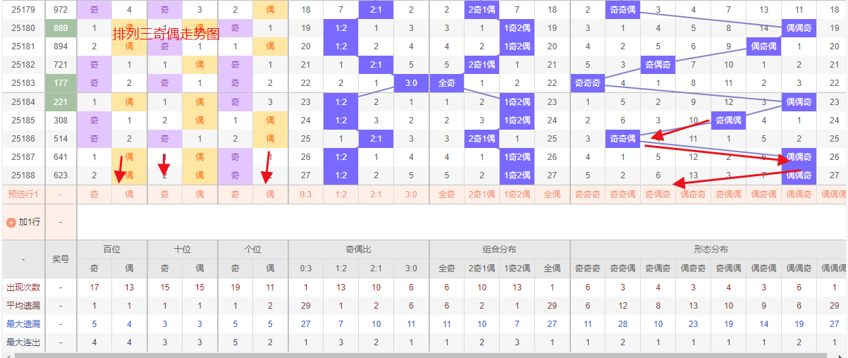 排列三 奇偶分析:从上图可以看出排列三100期内百位奇偶比约为45比55,十位奇偶比为52比48,个位奇偶比为49比51,个位的比值比较均衡,但是百十位的比值偏差就有点大,历史奇偶形态近2期开出偶偶奇后下一期的走势为,第106期开出偶偶奇后107期开奇奇偶, 第112期开出偶偶奇后第113期开偶奇奇,第126期开出偶偶奇后第127期开偶奇偶。近期排列三奇偶组合走势呈现明显升温迹象,其中"奇奇偶"和"偶奇奇"两种组合从温号区间逐渐走强,出现明显的转热信号。从历史数据来看,这两种组合在近10期内的出现频率显著提升,特别是"奇奇偶"组合已连续3期保持活跃态势,显示出较强的延续性。近期选号时重点关注这两种组合的持续表现,适当加大防守力度。同时也要留意其他奇偶组合的冷态回补,合理分配投注比例,在追热的同时防范冷号反弹。所以排列三2025189期奇偶形态推奇奇偶与偶奇奇。