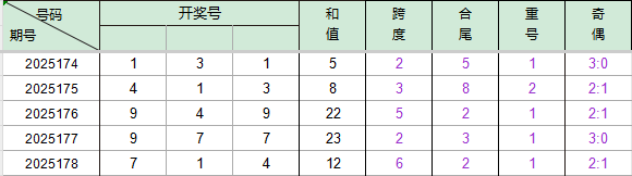 开奖回顾:体彩排3 第2025178期开出中奖号码为714,组合形态为组六、和值为12、合尾2、跨度6、重号1、奇偶比为2:1、百位7近30期出现5期,十位1近30期出现5期,个位4近30期出现4期。