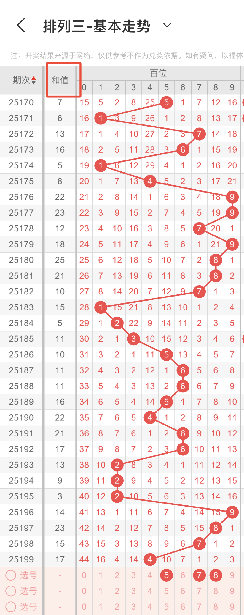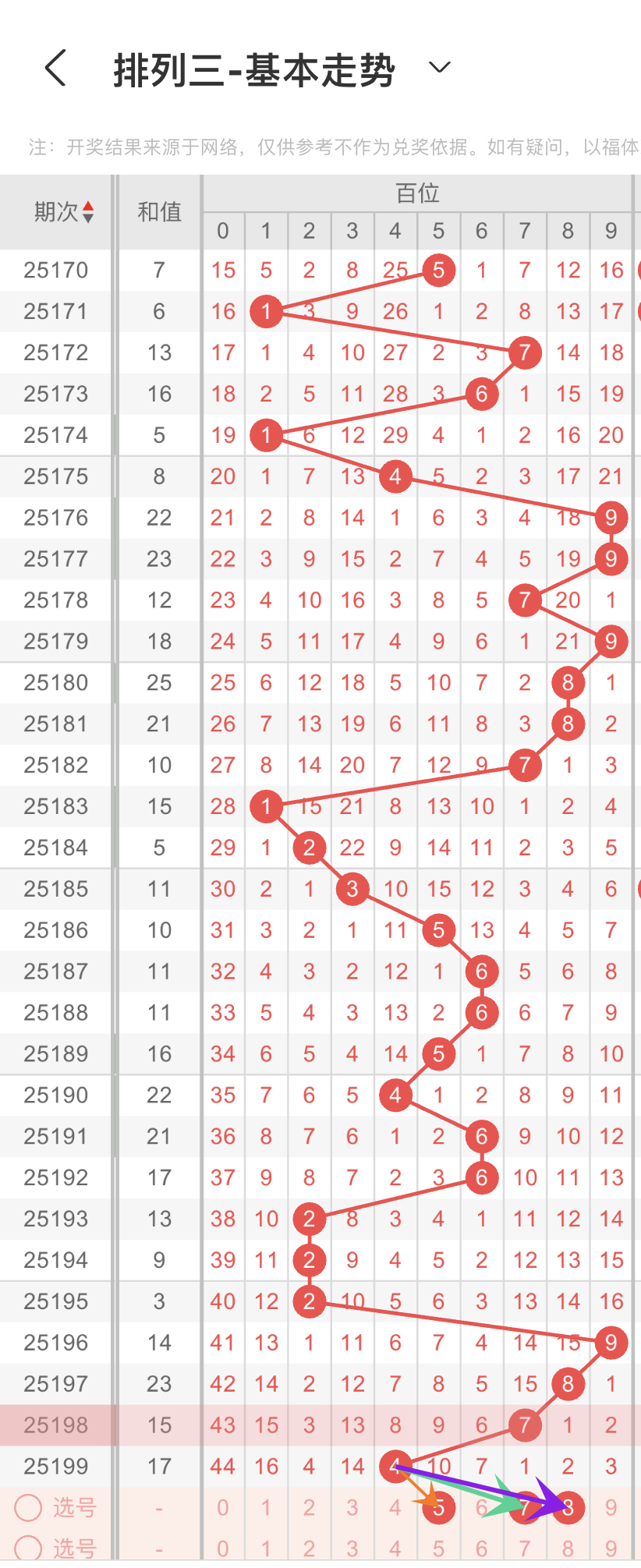 结合上面的大小、奇偶以及012路比,我们可以得到的数据分别是第一组56789,第二组13579,第3组258,我们重点选择3组数据中重复的,那百位我们选择5,防2路的8,1路的7,综上所述百位选578
