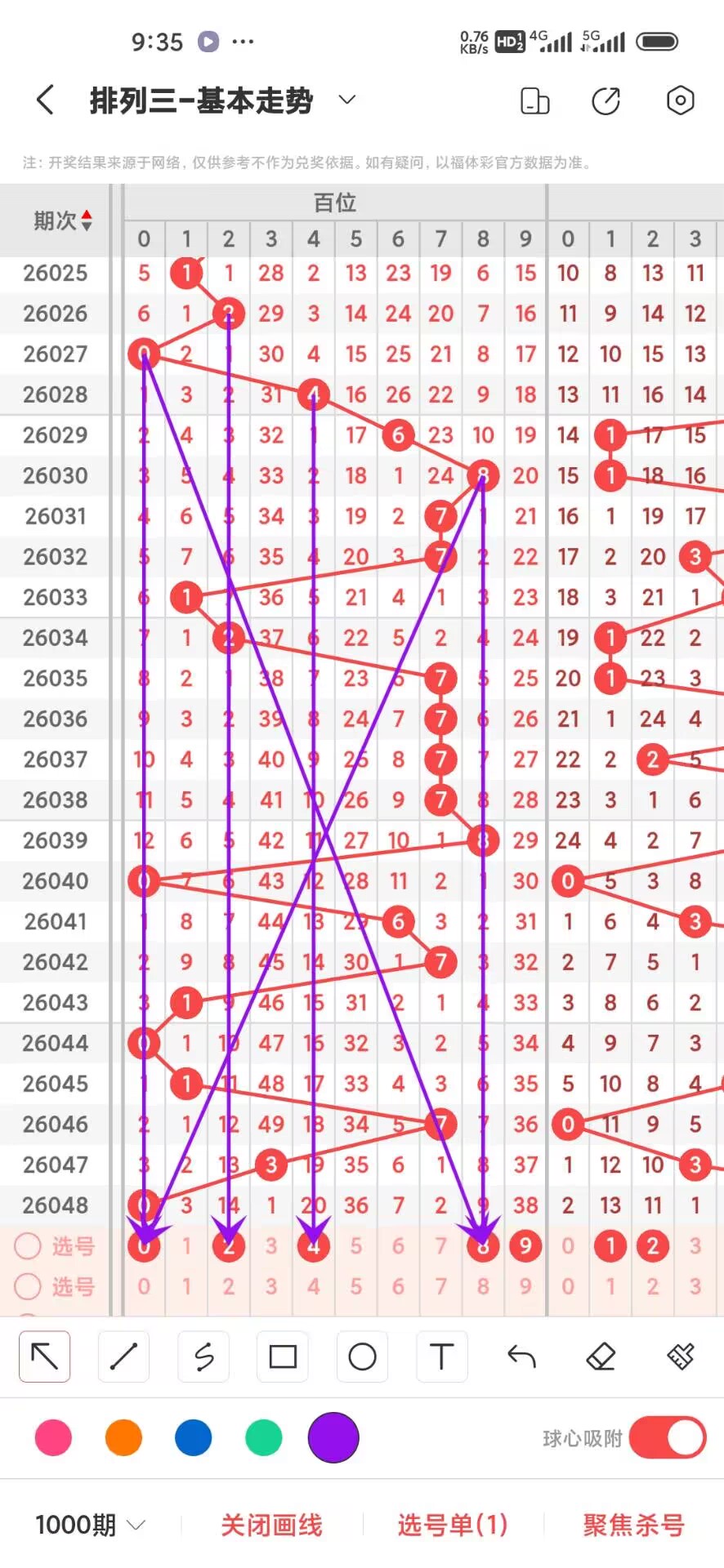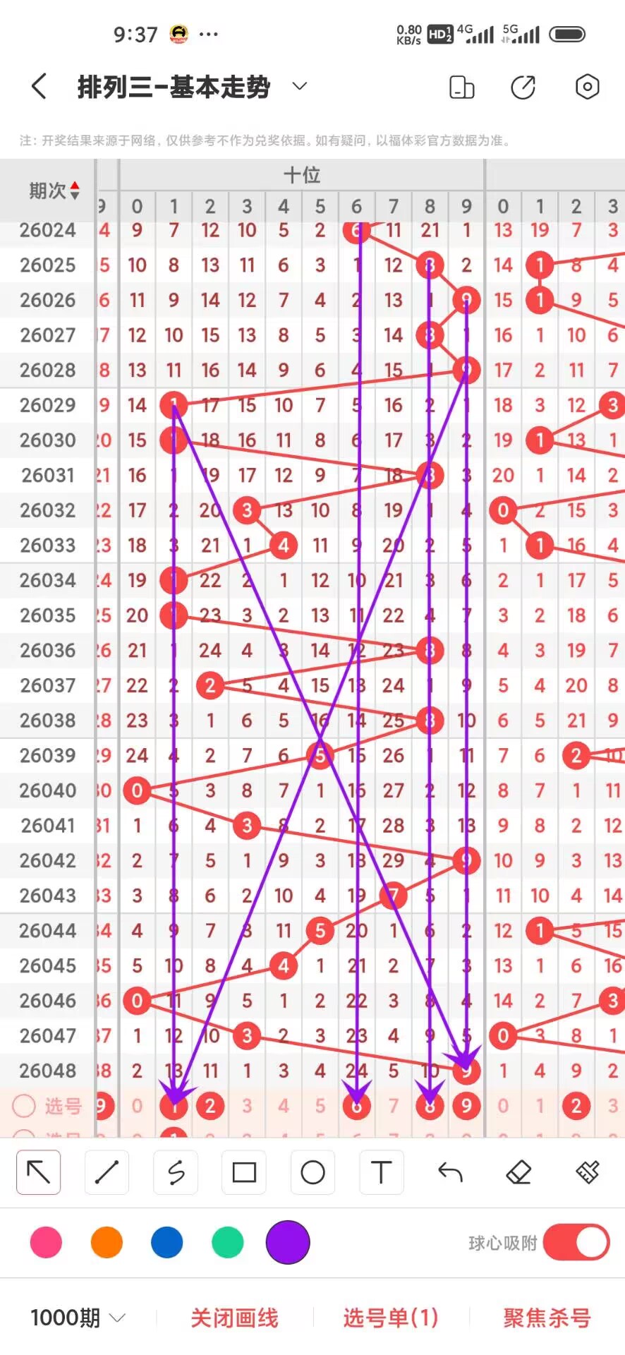 2026049期,上期百位开出偶,我们通过走势图来看500期012路中下号的数据,0路号码的最大总数是183次,0369分别在300期内下号分别是48,42,50,43,这几个数之间6下号最多,我们再来看1路号码最大总数是162,147号码分别是,62,46,54,这三者之间4下号最少,再回过头来看2路号最大总数是155次,258号码分别是52,44,59次,这三个数之间5下号最少,通过上面的分析百位目前小号热度比较高我们可以关注下,我们可以看出目前百位01路号码走势比较好,2459号码走势就有点冷淡,今天百位我们重点关注2489,具体看下面走势图