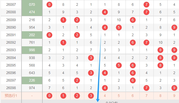 上图是体彩排列三开奖号码走势分布图,我用蓝色箭头标注出来的数字0123这个区域上期一个数字都没出现,最近几期出号码也不多,这个区域的数字一共有4个,那么本期这个区域的数字可以关注出一个或者两个,防出3个吧。