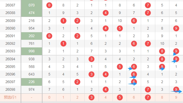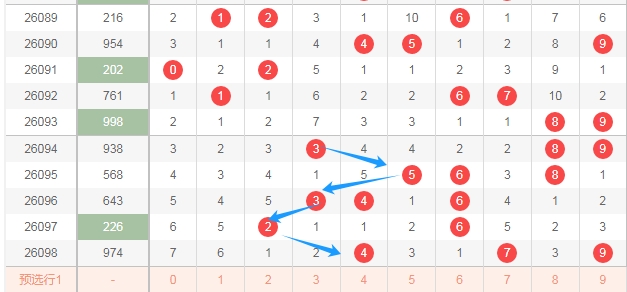 上图是体彩排列三开奖号码走势分布图,我用蓝色箭头标注出来都是右边这个数字都是合数数字,很明显最近右边这个数字连续6期开出的都是合数数字,那么本期可以关注右边这个数字出质数数字,假设出质数数字的话,那么数字357可以关注出一个。