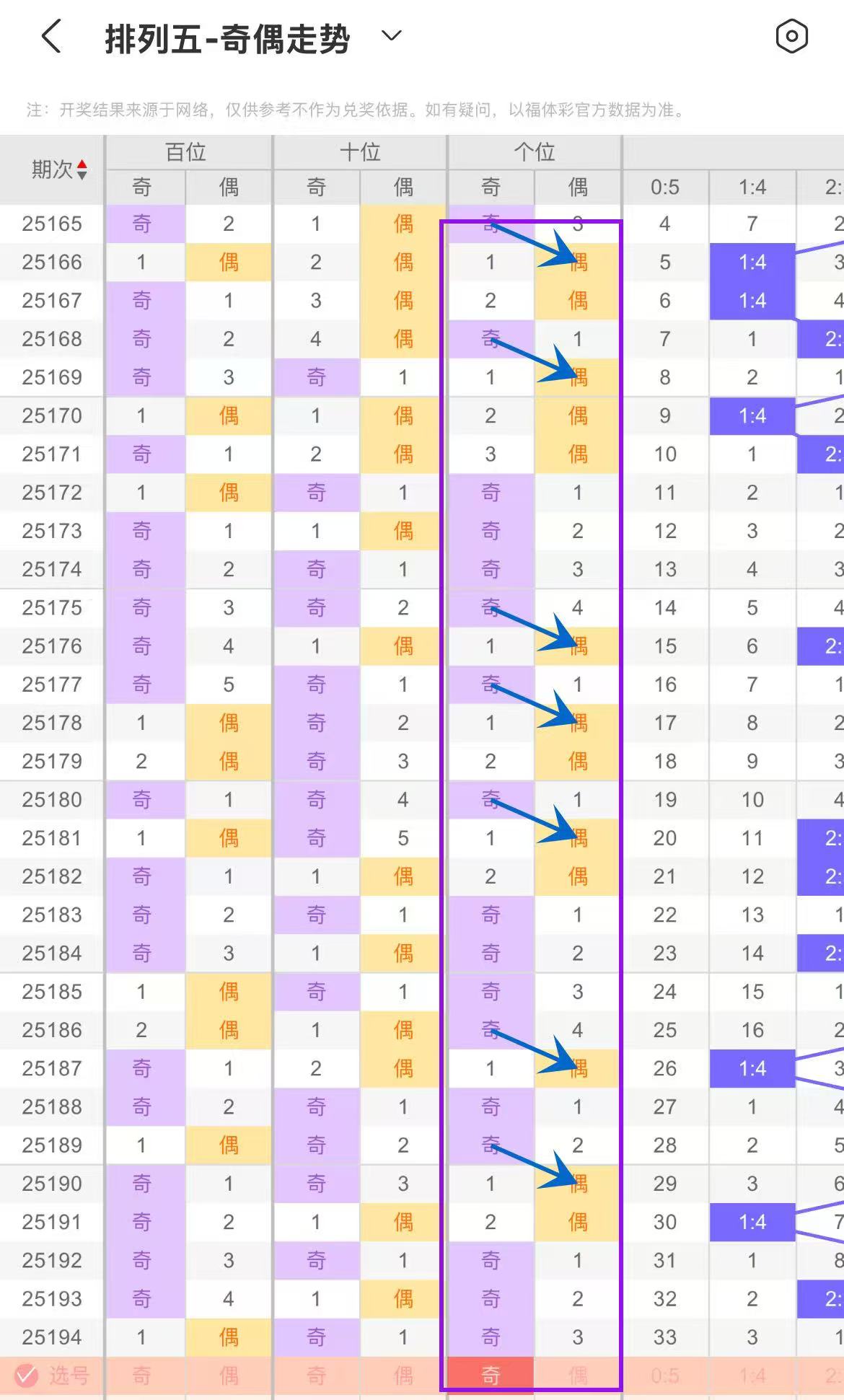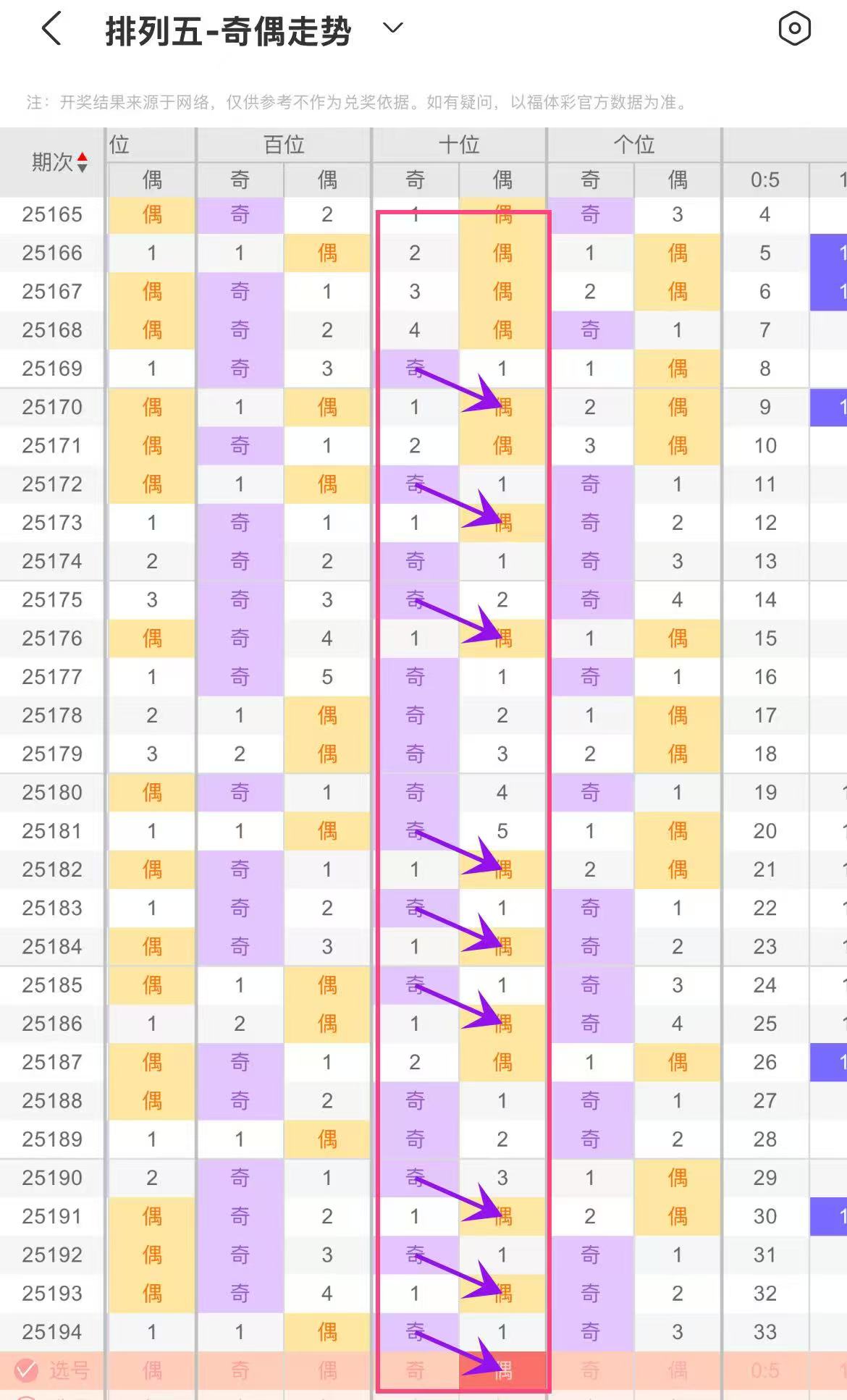 根据上图排列五十位奇偶形态走势分析,偶数连下趋势显著,多次持续主导十位节奏。回补箭头显示,当偶数连下周期结束,奇数借回补契机回归。走势上,连下与回补交替,需关注偶数连下长度,其终止节点是奇偶转换关键。若偶数连下周期长,回补的奇数可能快速接管,若周期短,偶数或再度连下,本期参考回补偶数(02468)