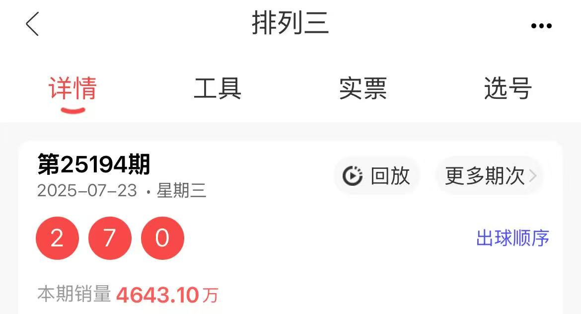 194期开奖号为270,形态组六,质合比2:1,和值9,跨度7,012路比为1:1:1,大小比1:2,奇偶比1:2