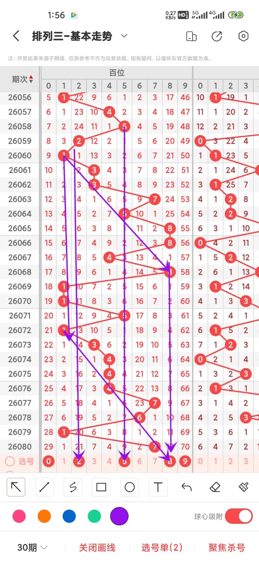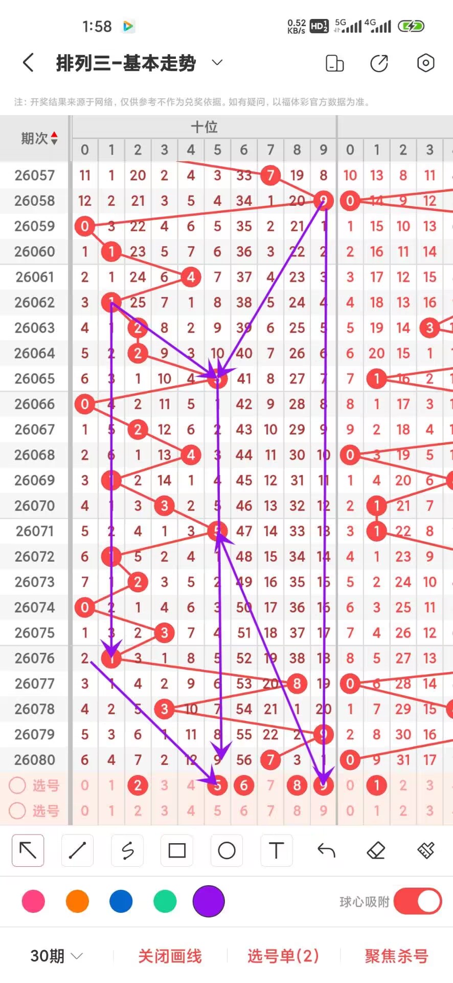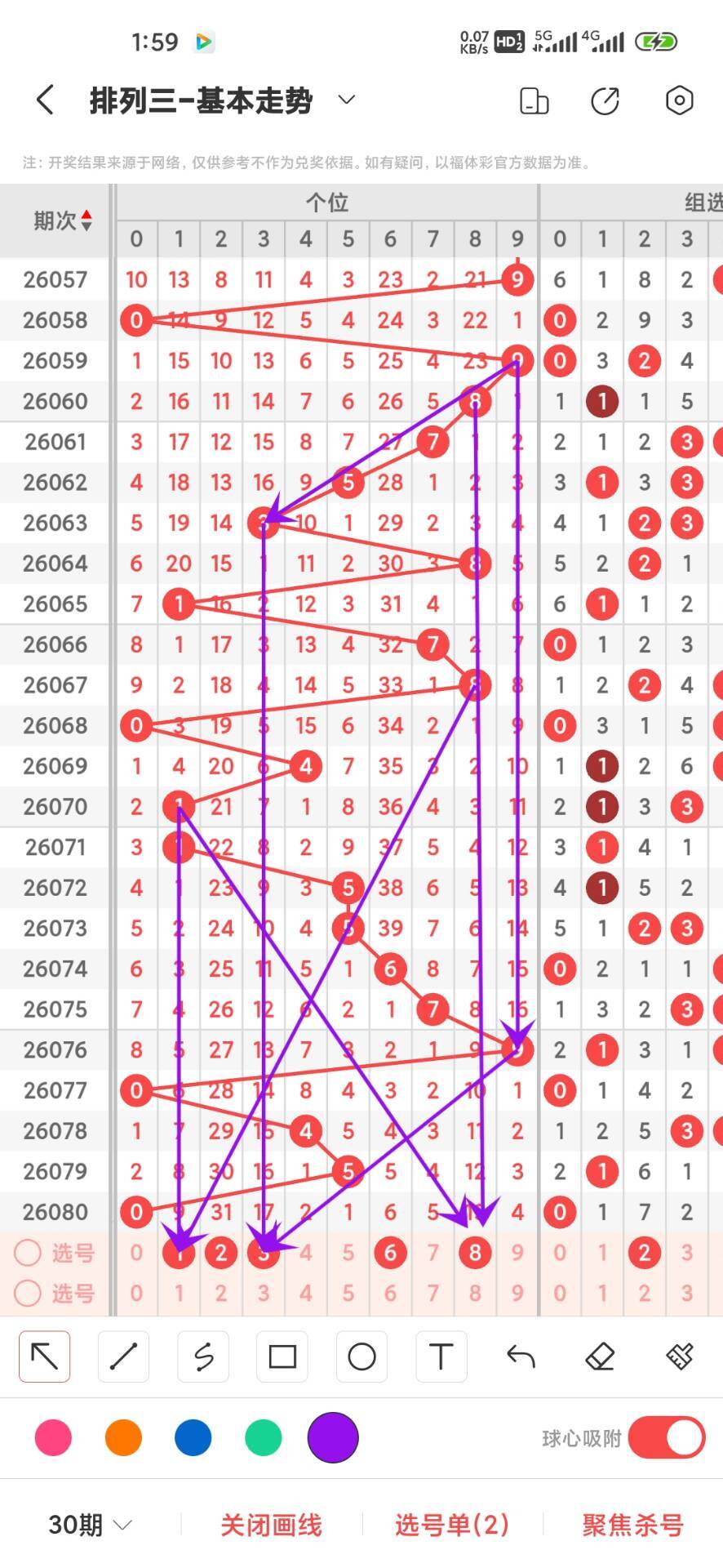 2026081期,上期十位开出奇数7,我们通过走势图来看100期012路中下号的数据,0路号码的最大总数是39次,0369分别在100期内下号分别是8,14,5,12,这几个数之间6下号最少,我们再来看1路号码最大总数是35,147号码分别是,17,9,9,这三者之间1下号最多,再回过头来看2路号最大总数是26次,258号码分别是9,8,9次,这三个数之间差别不大,通过上面的分析十位目前大号热度比较高我们可以关注下,我们可以看出目前十位01路号码走势比较好,46号码走势就有点冷淡,今天十位我们重点关注24569,具体看下面走势图