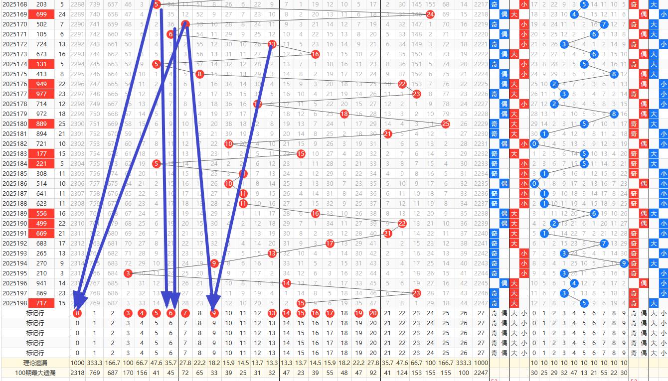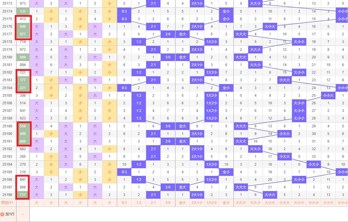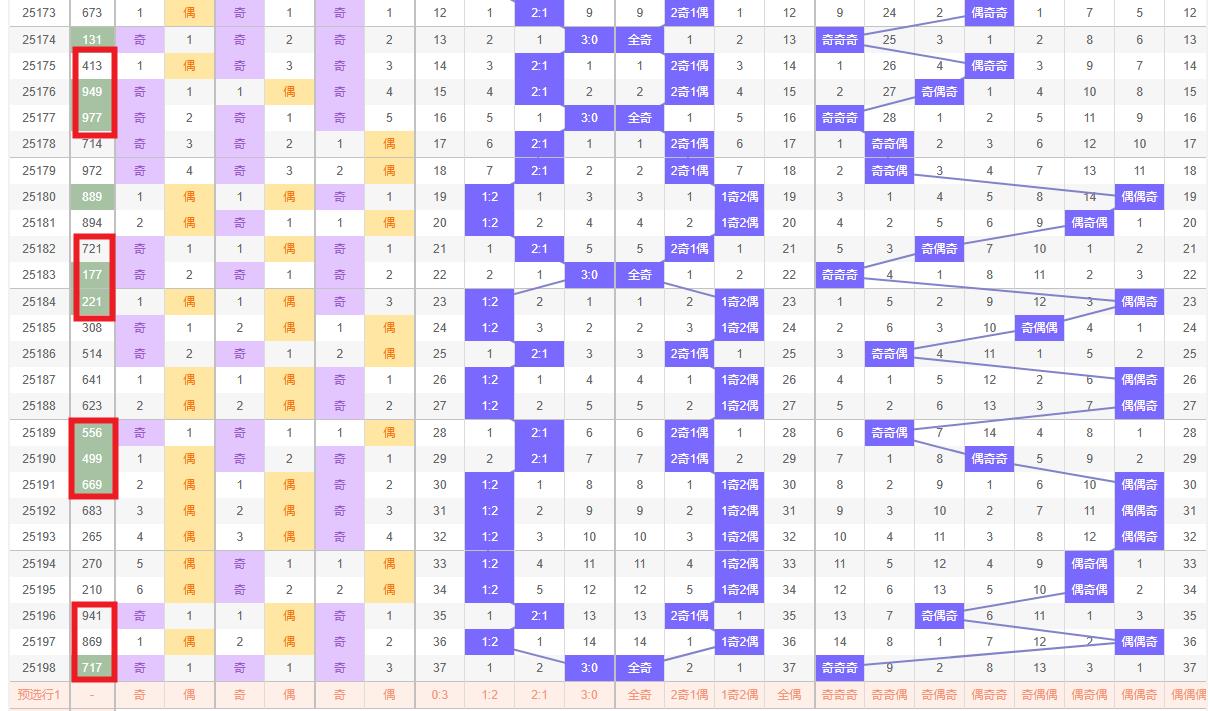 大小走向分析 根据198期开奖号码717,可以看到大小形态为大小大。在最近的走势中,大小号码开出比例基本持平。因此,对于199期,可以预期大小号码继续维持均衡状态,关注大小比1:2的组合。