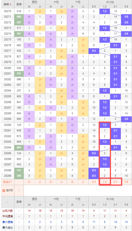 上期大小比:0:3,近10期大小比出现情况:1:2、2:1、2:1、1:2、2:1、0:3、1:2、1:2、0:3、0:3,最近10期出3期2:1,出现4期1:2,出现3期0:3,出现0期3:0,根据近10期出号规律本期推荐遗漏2期的1:2,防遗漏5期的2:1,综上所述大小比推荐:防:2:1,重点关注:1:2。