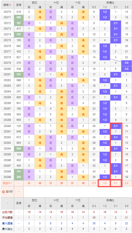 上期奇偶比:1:2,近10期奇偶比出现情况:2:1、1:2、2:1、1:2、2:1、1:2、1:2、2:1、2:1、1:2,最近10期出现5期2:1,出现5期1:2,出现0期0:3,出现0期3:0,根据近10期出号规律本期推荐看好连出1:2,防隔期出2:1,综上所述奇偶比推荐:防:2:1,重点关注:1:2。