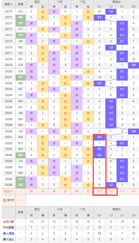 上期质合比:1:2,近10期质合比出现情况:3:0、0:3、2:1、0:3、0:3、2:1、2:1、2:1、2:1、1:2,最近10期出现5期2:1,出现1期1:2,出现3期0:3,出现1期3:0,根据近10期规律本期推荐连出1:2,防遗漏5期出0:3,综上所述质合比推荐:防:0:3,重点关注:1:2