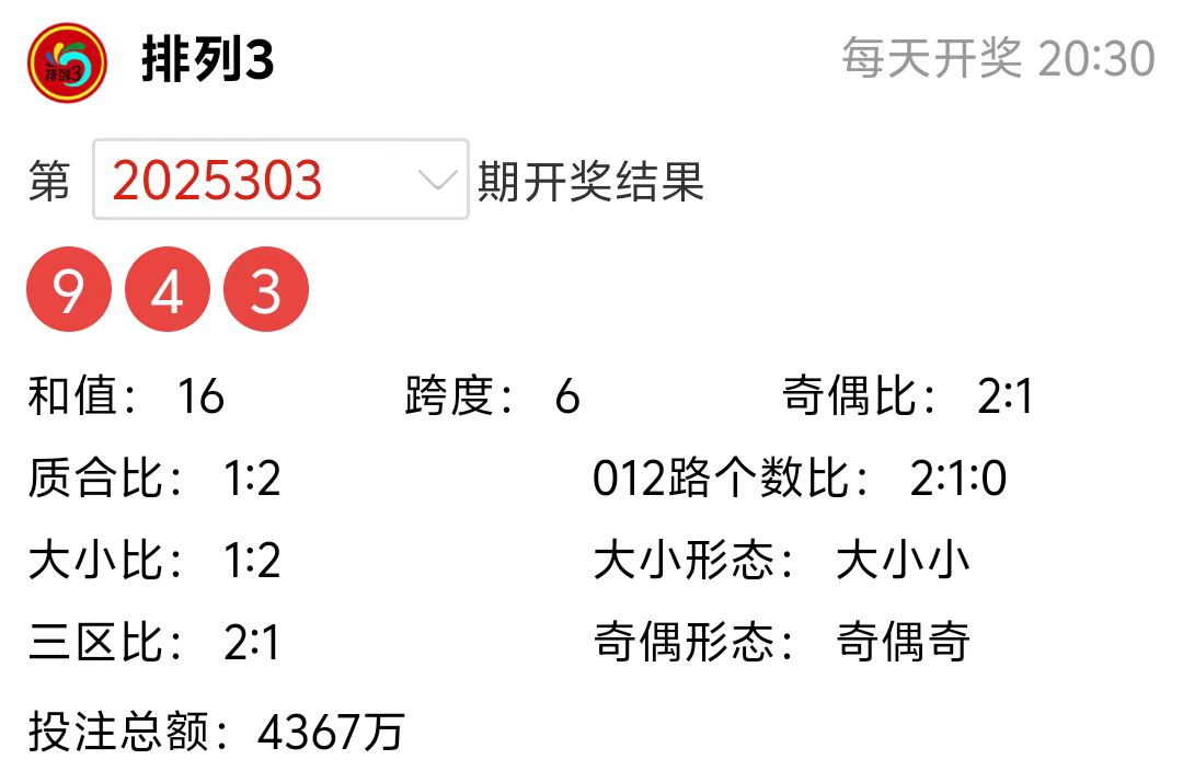 排列3上期开两奇一偶9、4、3,跨度:6,和值:16,奇偶比:2:1,质合比:1:2,大小形态:大小小,三区比:2:1, 012路个数比:2:1:0