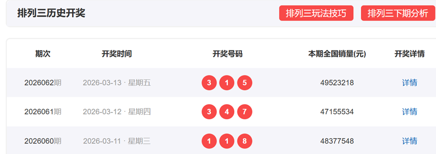 体彩排列3上一期,开奖号码为315,形态为组六,奇偶比为3:0,012路数值表现为012,和值09,和尾9,跨度4。