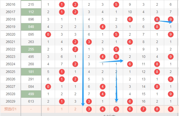 看上面走势图中标注出来的数字3456789,把这些数字当成一个区域的话,你们看这个区域的数字出连号组合已经遗漏了6期,上面的蓝色箭头就知道,连号组合遗漏了6期上次遗漏了4期,那么本期可以关注这个区域出连号组合,这个区域的连号组合有34 45 56 67 78 89一共有6组。