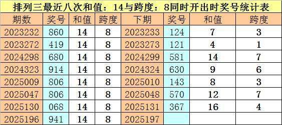开奖回顾:体彩排列三第2025196期奖号为:941。和值为:14,跨度为:8。