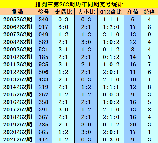 开奖回顾:排列三第2022261期开出奖号026,奖号012路比为2:0:1,大小比为1:2,奇偶比为0:3,最近三年第262期同期开出奖号为:第2019262期:785、第2020262期:665、第2021262期:414。
