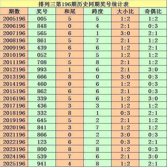 上期回顾:排列三第2025196期奖号开出941。