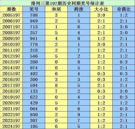 历年第197期排列三同期奖号开出:788、949、713、357、941、778、318、546、280、974、402、300、594、133、622、429、064、930、307、105。