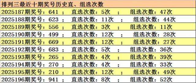 开奖回顾:排列三2025196期开奖:941,组六,和值14,跨度8,奇偶比2:1,大小比1:2。