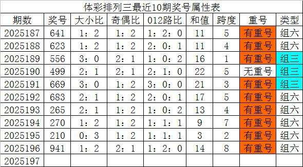 体彩排列三最近10期分别开出奖号:641、623、556、499、669、683、265、270、210、941,各奖号属性详见下表: