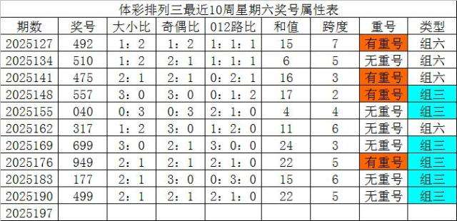 体彩排列三最近10周星期六奖号分别为:492、510、475、557、040、317、699、949、177、499,各奖号属性详见下表: