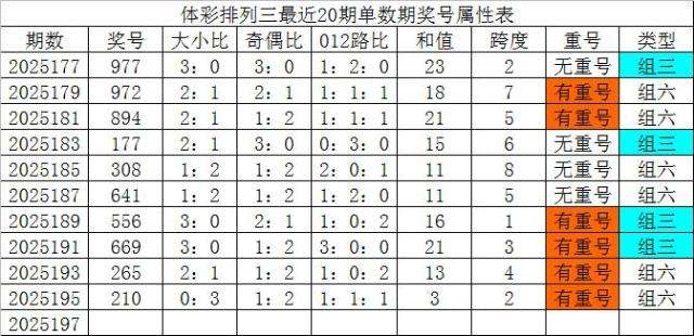 体彩排列三最近20期单数期奖号分别为:977、972、894、177、308、641、556、669、265、210,各期奖号详细属性下表: