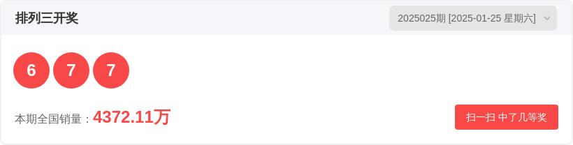排列325025期开奖结果6 7 7,大小比3:0,奇偶比2:1,质合比2:1,和值尾0。