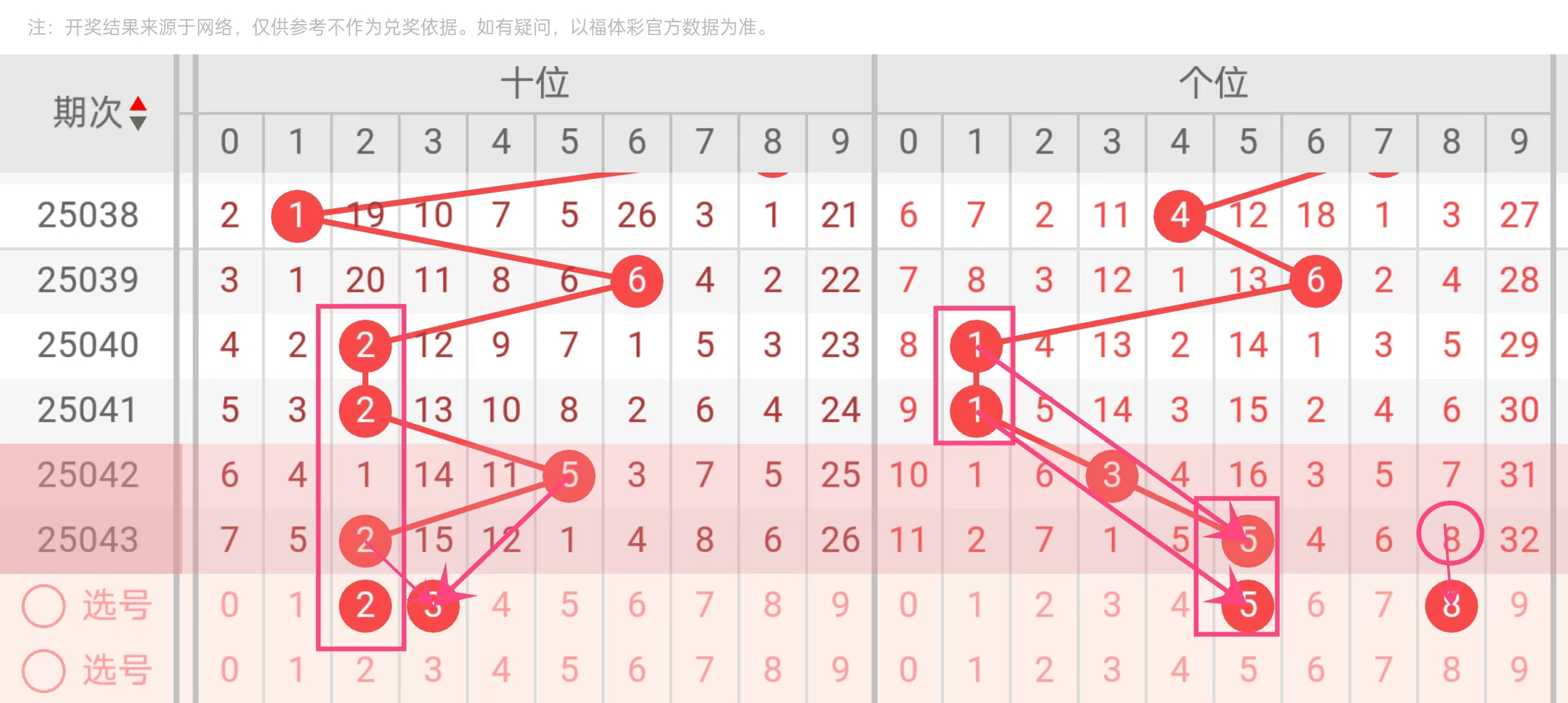 分析知道根据走势技巧个位数更满足我前分析得至少会有数字5或者8其中1个,十位根据走势技巧我选了2个缩水号码分别是数字2和3.
