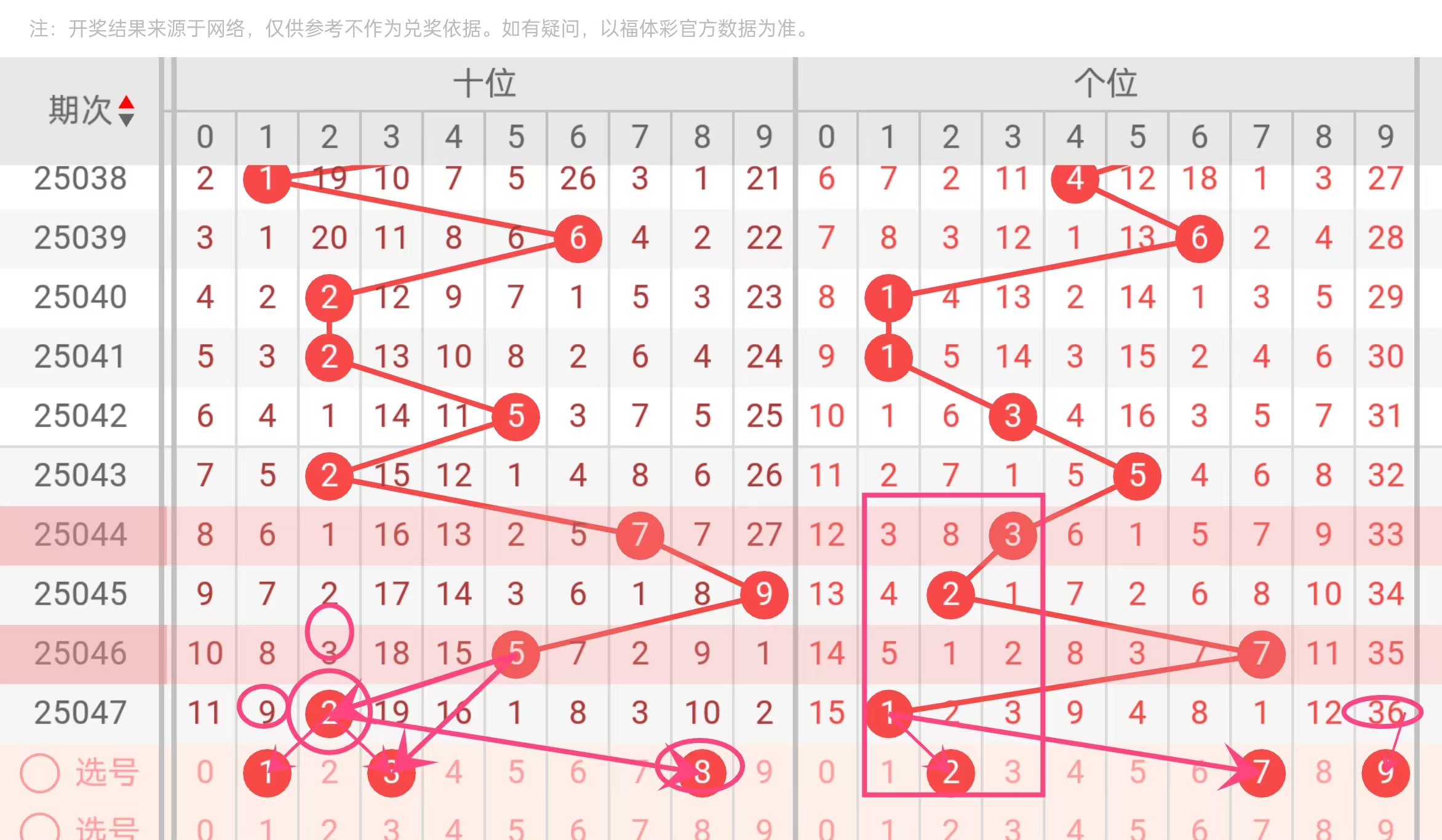 - 第一位:数字“0”在近20期中仅出现2次(冷号),当前遗漏18期,达到冷号阈值,且与上期“3”形成跨度3(3→0)。