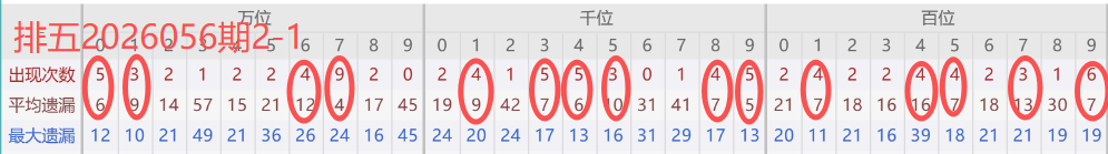 2026051期开奖号码04537,万位近30期0出现5次数(减位回补) ,千位近30期4出现3次数,百位近30期5出现3次数(较053期减2),十位近30期3出现2次数 (较054期减一),个位近30期7出现6次数(较053期减一) 。
