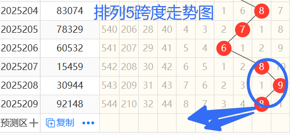 2)我们来看跨度,以205期——209期为例,如图依次是76898跨度,按照012路的排序是10202路跨度,后面两期不是同路跨度,根据路数转换关系来看,本期0 2路跨度,那么跨度我们暂定369258跨,个人比较看好 5 4 跨度