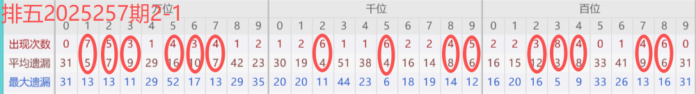下图所圈出的为近30期各位置所出现的热码出现次数及平均遗漏值,用以参考和一些冷码组合选号。
