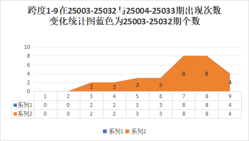 图中我作图并没有考略像00000这种5同号,特殊的不能在特殊,很难遇到,共10组。根据我做的图知道,图中2个区间图形重合,图中跨度7是在30期内(25003-25032与25004-25033)区间出现的次数分别是8和8,跨度8在先25003-25032期间内减少,在25004-25033期又增多,根据一起彩30期(25004-25033)内跨度走势图知道下一期少的跨度是7,因为两期减少增加的跨度都是7,是1路号,下一期减少的跨度7是1路号,分析知道下期不会在出现增多的1路号,出现次数太频繁了。也就是跨度组合杀掉1,4,7,至此我们会得到一组缩水号码。接下来根据一起彩排列五走势图分析各个位可能落得号。