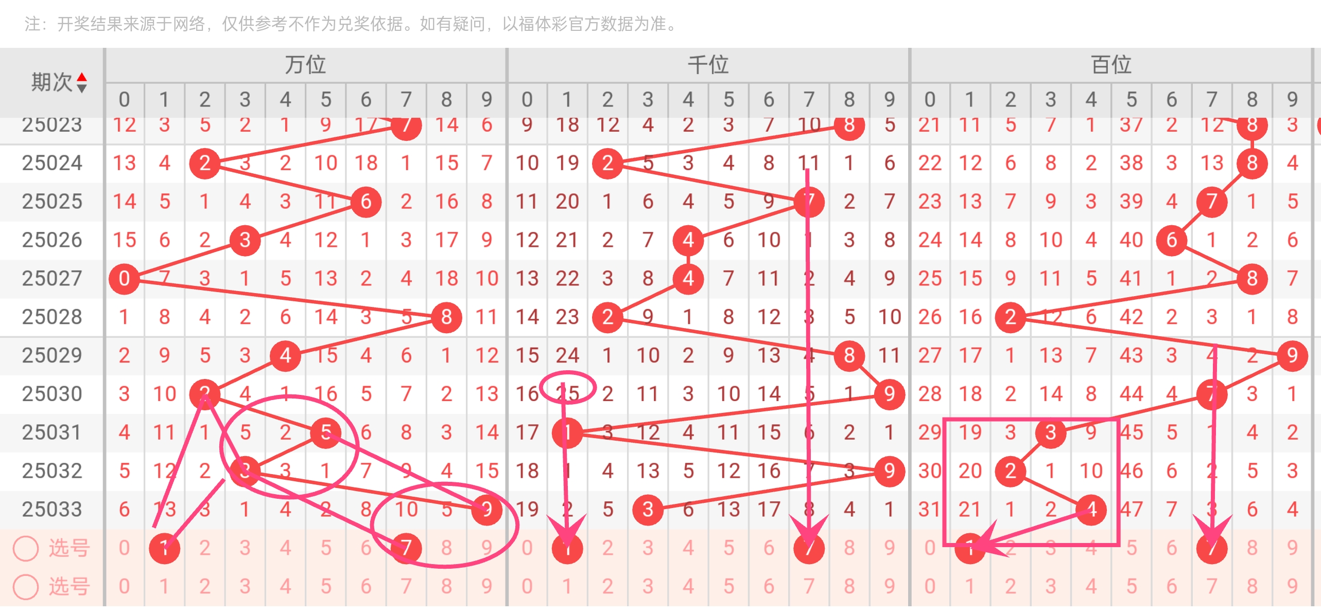 我分析排列三选择得2个号码组选【17】全拖一注同样也是我买的号(分析过程排列五直接用,想看得点击头像查看同期排列三2码全拖分析技巧),经过我的综合分析图中我选择得万位号码是7,千位号码是3,百位号码是1,图中标记万位得7是数学中平行四边形势技巧,优先级在我这高于百位间隔周期差1得相邻走势技巧更远远高于千位间隔周期都是同路号的相似技巧。百位数字1矩形区域内四连号顺序走势技巧要比千位冷号回补又变热得走势技巧概率要大,千位数字1和7都没有万位和百位大,根据走势技巧我分析百位号落重复号3.我选择得排列五前三位731知道跨度是6,满足我上文分析得排列五跨度杀号关系,根据这一数关系,并通过数学计算知道排列五十位和个位数字数字0合8不会单独出现,出现数字0和8必然会是组合形式出现,满足条件得十位个位组合有【08】【09】等,接下来根据走势图缩水十位个位号码。