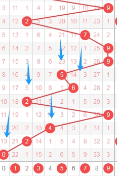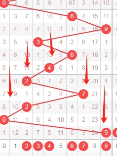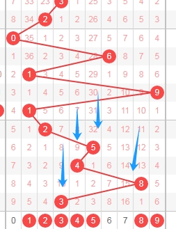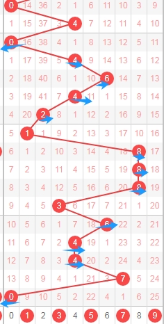 上图是体彩排列五从左到右定位第四位数字,我标注出来的数字都是偶数数字,我标注出来的蓝色箭头都是奇数数字,奇数数字又连续开出了4期,最近十几期开出的奇数数字多,那么本期第四位数字可以关注出偶数数字02468。