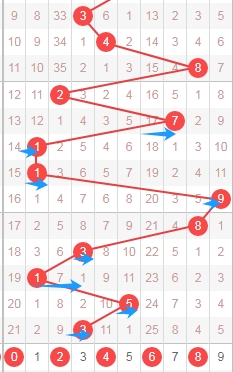 上图是体彩排列五从左到右定位第三位数字,我标注出来的数字都是奇数数字,我标注出来的蓝色箭头都是偶数数字,很明显最近十几期开出的偶数数字多,那么本期第三位数字可以关注出奇数数字13579,个人最看好数字1379。