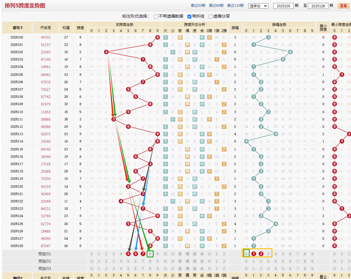 跨度近10期集中在4-8区间(占比80%),上期开出9-7-5 -6 8-5 -3-5 9 -9-8-6 -8-7-5 -7-4-7 -9-5-8 -9-8-?跨,从0123振幅来看23振幅首选推荐跨度56。从012路来看0路6跨度好。 个人129期看好跨 6 防 578