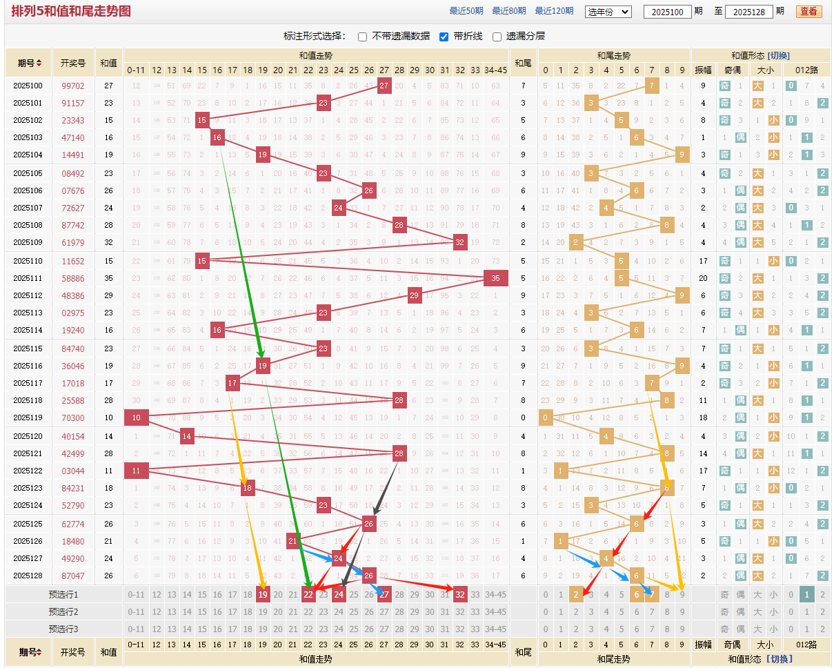 上期开出87047和值26走一个小退格,根据平衡原则近期和值32-15-33-29-23-16-23-19-17-28-10-14-28-11-18-23-26-21-24-26,形成梯形斜线,4-5-6-6-4-2-11-18-4-17- 7-5-3- 5-3-2振幅,根据趋势来看今天会不会再走3振幅,本期考虑中和值范围(19-32)重点考虑,129期个人觉得考虑2479尾。推荐和值 22 27 防24 19 32