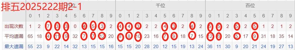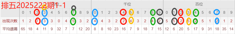下图所圈出的为近30期各位置所出现的热码出现次数及平均遗漏值,用以参考和一些冷码组合选号。