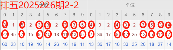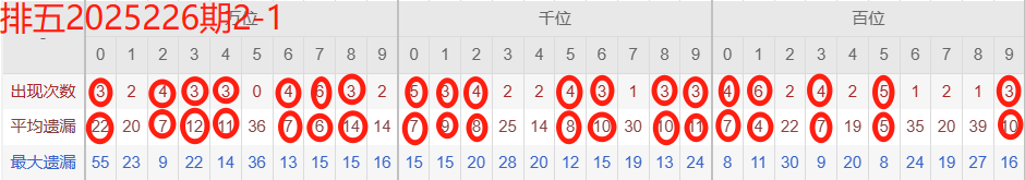 下图所圈出的为近30期各位置所出现的热码出现次数及平均遗漏值,用以参考和一些冷码组合选号。