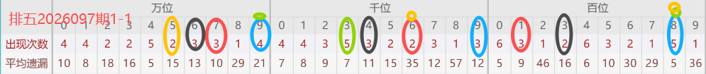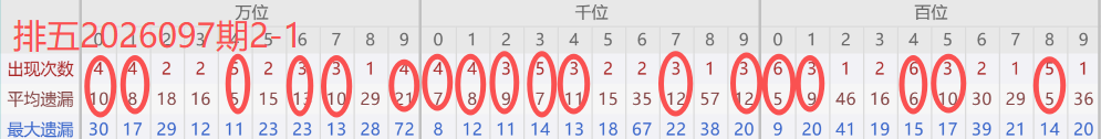 下图所圈出的为近30期各位置所出现的热码出现次数及平均遗漏值,用以参考和一些冷码组合选号。